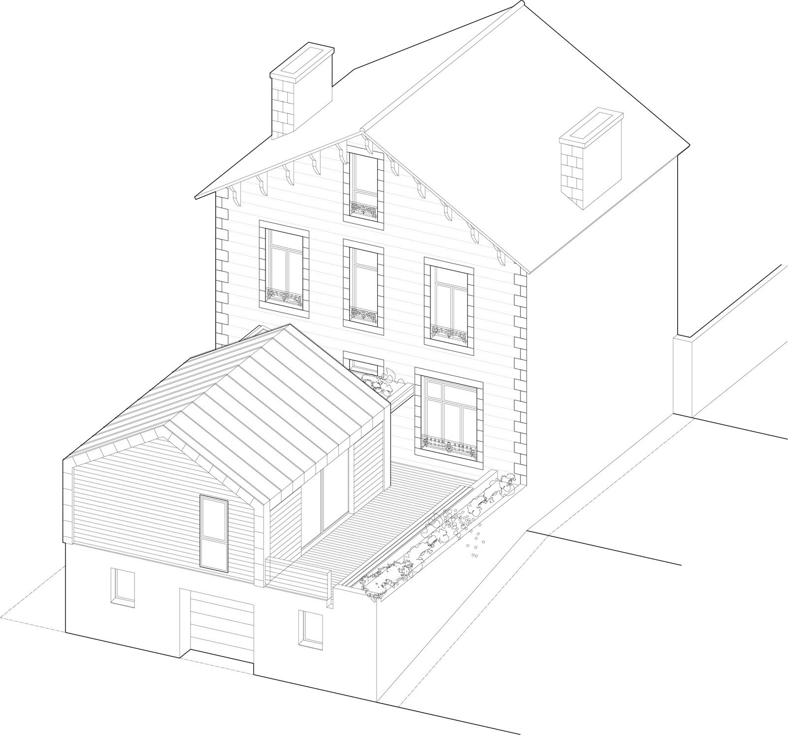 Madame K n’utilisait pas le toit terrasse existant sur le garage de sa maison, car cet espace était peu intime, et très venteux. Madame K. nous a demandé de penser un volume en extension / surélévation à usage de salon de musique, en lien avec les pièces de vie de la maison existante.